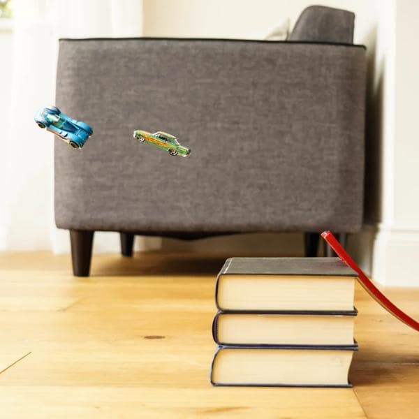 Gebruik je bestaande speelgoedauto’s, bevestig hem eenvoudig aan een raam of deur, rol hem uit en begin te racen – alleen aangedreven door de zwaartekracht, zonder batterijen of dure toevoegingen.